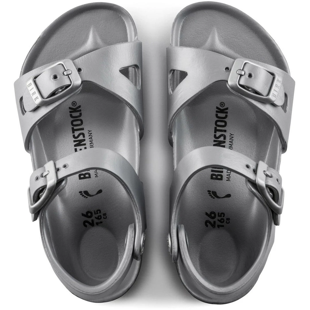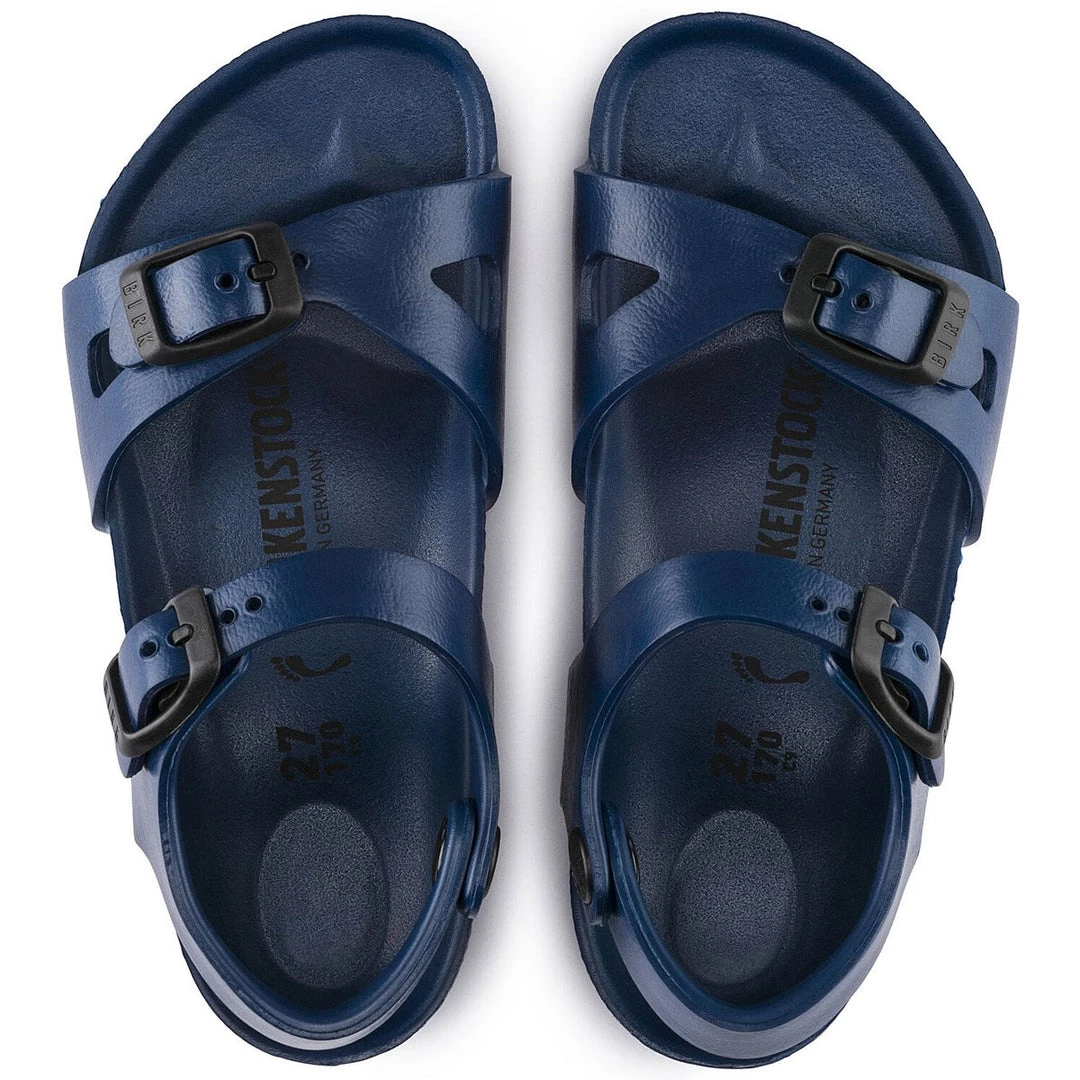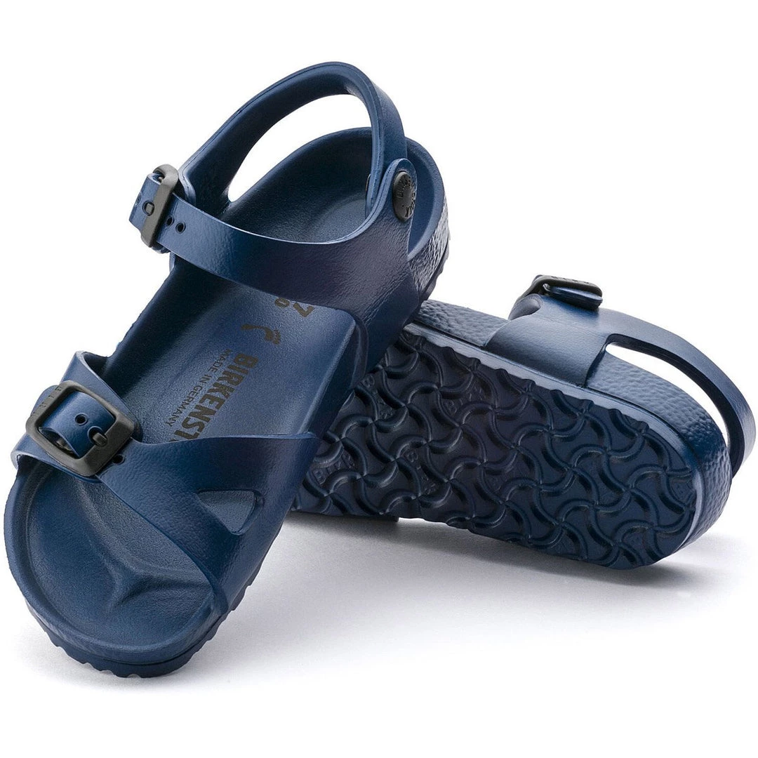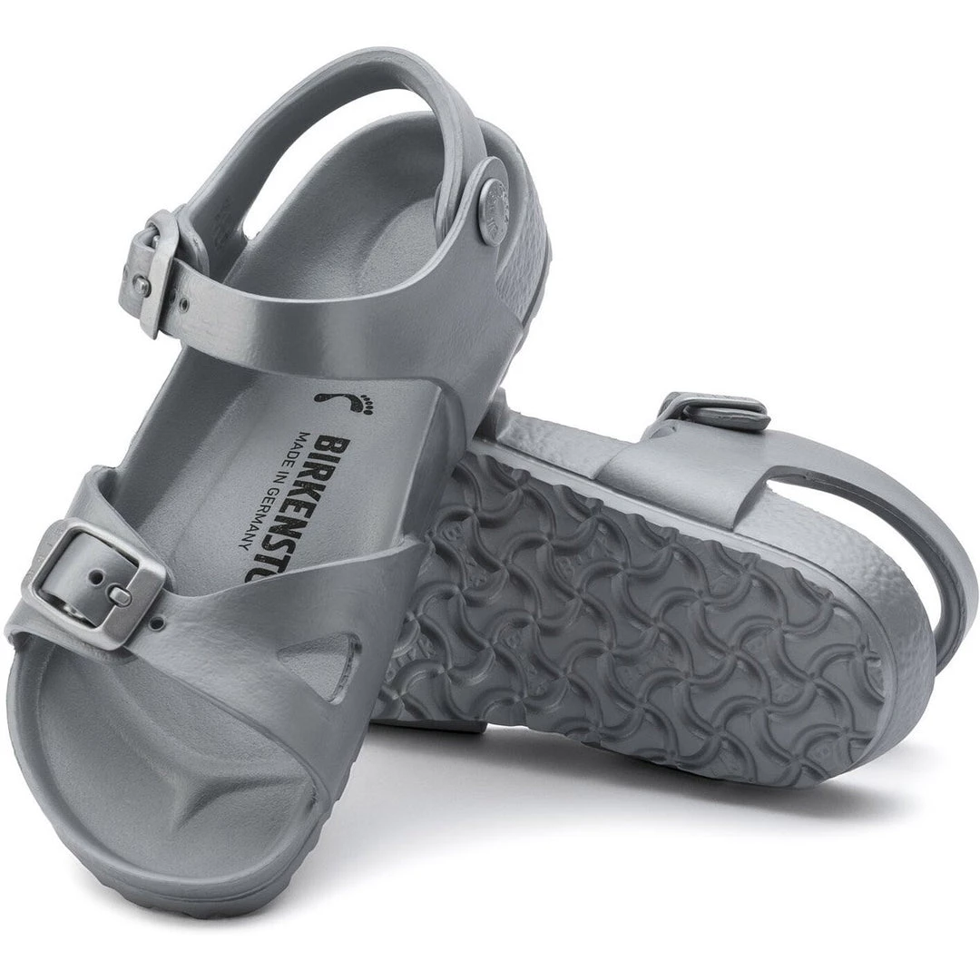 The BIRKENSTOCK Rio model is a classic kids’ shoe. Designed back in the 1970s, it has been a laid-back summer companion for generations of children ever since. Shown in EVA, a synthetic waterproof and lightweight material. Super lightweight – great for after the gym or the beach.
