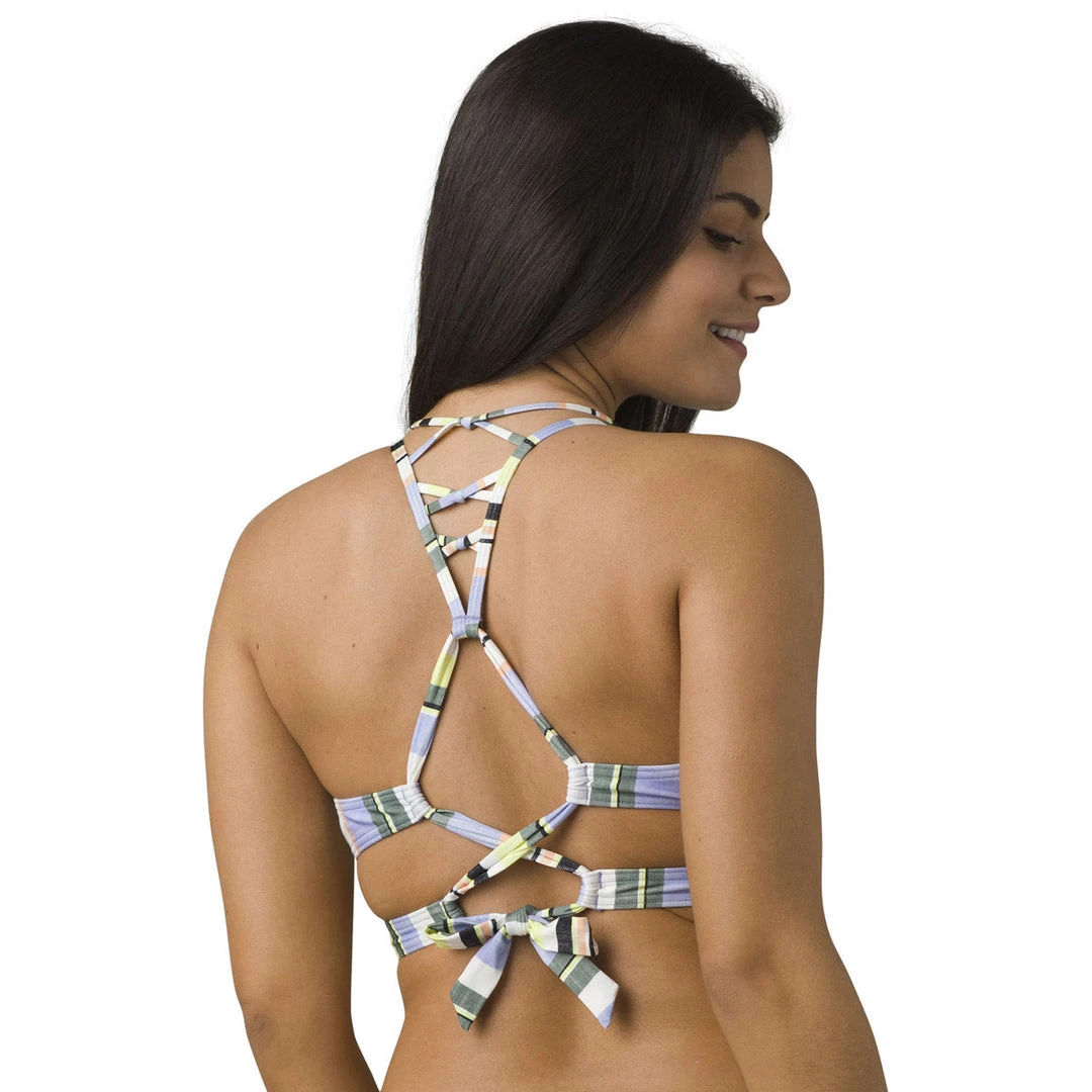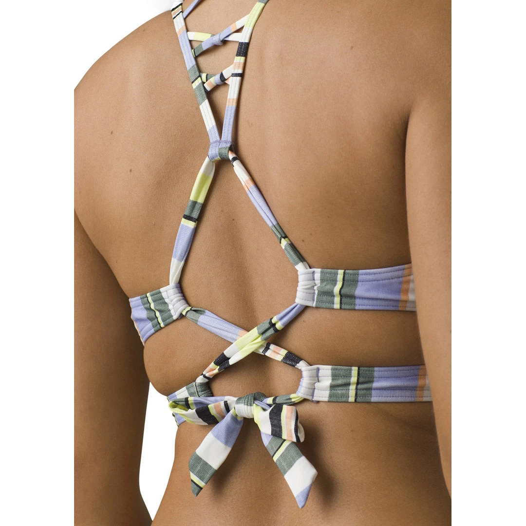 The Atalia Top for women is a fun twist on traditional triangle bikini style. A double back strap detail with crisscrossed tie closure is the perfect blend of secure and stylish. And the knotted multi-strapped back and peek-a-boo side cutouts make it a fashion-forward favorite in any swim collection.